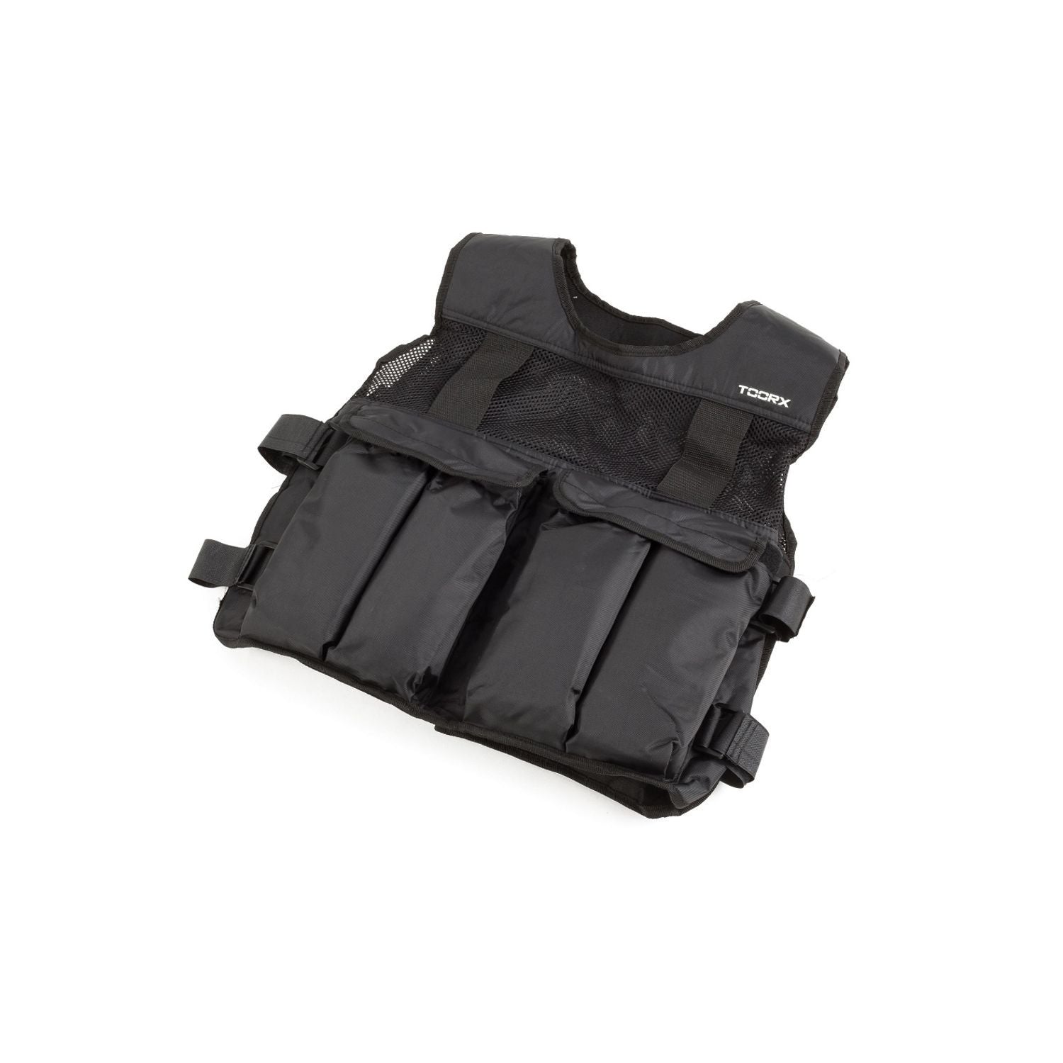 O colete é feito de nylon e é pesado com pesos de 10 kg divididos em pesos de 2,5 kg, que são removíveis e, portanto, ajustáveis.