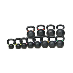 Cada kettlebell tem uma faixa colorida para identificar os pesos mais facilmente.