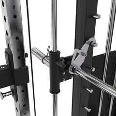 - J-CUP/Braços de Segurança Extra forte de 5 mm de espessura com proteção UHMW (Ultra High Molecular Weight), ajustáveis entre 43,2 - 198,2 cm em 31 níveis, distância central 5 cm