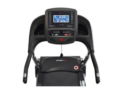 A passadeira está equipada com uma consola prática com visor LCD 17,2 x 7,9 cm azul retro iluminado onde se pode ver informações sobre velocidade, inclinação, frequência cardíaca, distância, tempo, consumo calórico e programa de corrida. A frequência cardíaca é obtida através dos sensores embutidos no guiador ou através de banda peitoral (não incluída).