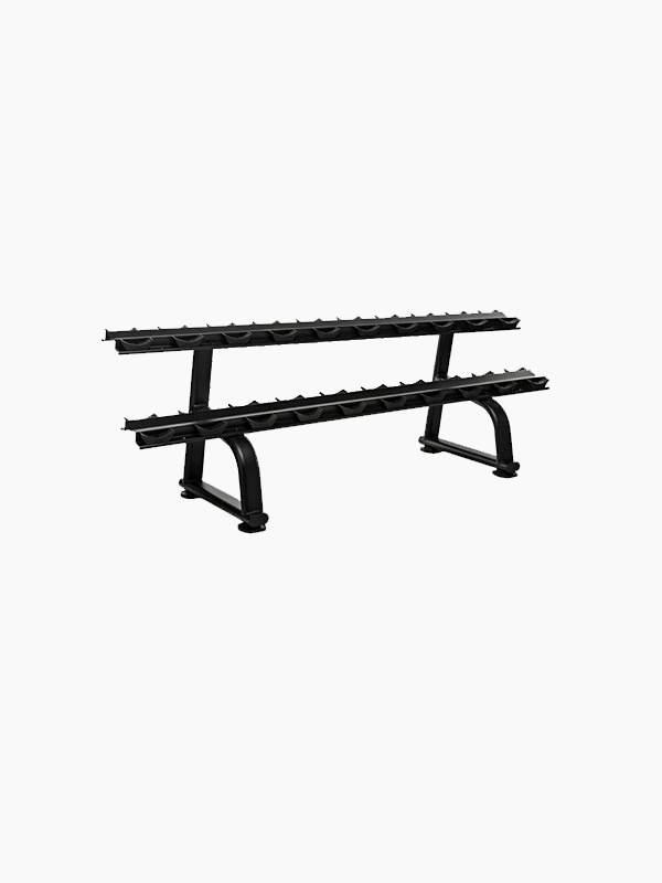 Suporte de armazenamento de dupla altura para 10 pares de halteres, feito de aço de alta resistência e revestido com tinta sintética preta anti-riscos e resistente ao impacto.